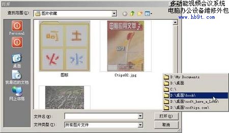 在Windows下工作時(shí),總有幾個(gè)文件夾是我們平時(shí)經(jīng)常要去的。但是Windows的文件對(duì)話框只提供了“歷史”、“桌面”、“我的電腦”和“網(wǎng)上鄰居”幾個(gè)選項(xiàng)供我們選擇。安裝Dialogue Box Assistant軟件,在打開和保存文件對(duì)話框的工具欄上會(huì)發(fā)現(xiàn)兩個(gè)小圖標(biāo),該軟件會(huì)把最近打開/保存過的文件/文件夾保存起來,(如圖9)所示,只要單擊最右邊的按鈕就可以看到我們最近訪問過的文件夾,單擊就會(huì)馬上切換到相應(yīng)的文件夾下。單擊對(duì)話框工具欄Dialogue Box Assistant左邊小按鈕會(huì)顯示最近打開過的文件。