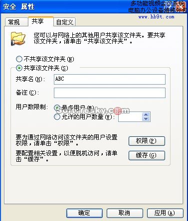 在“屬性”對(duì)話框中,選中“共享該文件夾”單選框(如圖1),以便與網(wǎng)絡(luò)上的其它用戶共享文件夾。