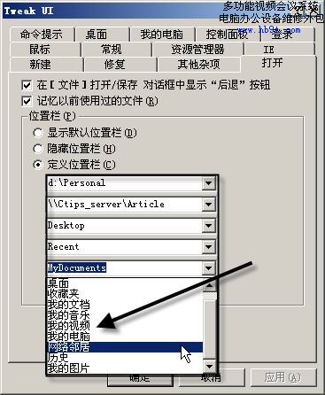 先安裝TweakUI工具,再選擇“開(kāi)始→設(shè)置→控制面板”,雙擊“用戶接口自定義”圖標(biāo),單擊“打開(kāi)”標(biāo)簽,選中“位置列”下的“自定義位置列”復(fù)選框。再在下面的文本框中選擇常用文件夾(也可以輸入自定義文件夾),(如圖4)所示。以后,就會(huì)在“打開(kāi)”和“保存”對(duì)話框的左側(cè)窗格出現(xiàn)相應(yīng)文件夾按鈕,單擊后即可進(jìn)入,非常方便。