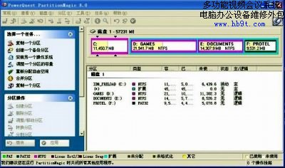 重新啟動電腦進入Windows XP,運行PQ8.0,可以看到當前硬盤中的分區(qū)情況,如下圖: