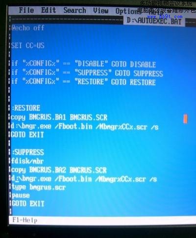 兩個文件創(chuàng)建完畢后,不要退出DOS,用edit編輯器打開D盤下的Autoexec.bat文件,大家注意了,此Autoexec.bat非我們剛才創(chuàng)建Autoexec.bat,它是由d2dfdzip.exe解壓縮而來的,它的用途就是在運行時自動執(zhí)行其中的指令,將相應的代碼寫到硬盤的引導扇區(qū)中,這樣就將F11鍵和恢復系統(tǒng)關(guān)聯(lián)起來了。在沒有軟驅(qū)引導的情況下這個文件也不可能自動運行了。因此就得靠人為輸入來執(zhí)行,但是原來這個文件是按照在軟驅(qū)中運行而編寫的,所以在路徑上稍作修改就行了。